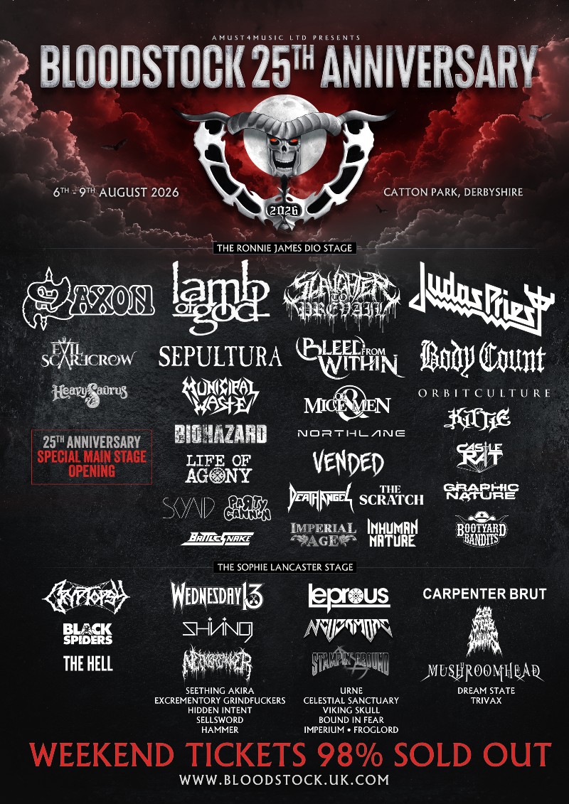 Tickets are flying fast – snap yours up now at the ticket store and be part of history at BLOODSTOCK’s silver anniversary! Wednesday early access is also available in some campsites for those who want to max out their BLOODSTOCK experience. Day tickets will go on sale at a later date. BLOODSTOCK’s 25th anniversary is going to be truly unforgettable. With many more bands & additional on site entertainment still to be announced, this is the must-attend celebration of 2026! BODY COUNT join an already heavy-hitting lineup including RJD headliners LAMB OF GOD, SLAUGHTER TO PREVAIL, JUDAS PRIEST, and SAXON. Over on the Sophie Lancaster stage, the headliners are CRYPTOPSY (None So Vile 30-year anniversary set), WEDNESDAY 13, LEPROUS, and CARPENTER BRUT. You’ll also be able to see SEPULTURA, MUNICIPAL WASTE, DEATH ANGEL, NORTHLANE, BLEED FROM WITHIN, VENDED, ORBIT CULTURE, THE SCRATCH, IMPERIAL AGE, LIFE OF AGONY, OF MICE & MEN, BIOHAZARD, 200 STAB WOUNDS, THE HELL, BLACK SPIDERS, SHINING, NEVERMORE, EVIL SCARECROW, HEAVYSAURUS, SKYND, PARTY CANNON, BATTLESNAKE, INHUMAN NATURE, KITTIE, CASTLE RAT, GRAPHIC NATURE, BOOTYARD BANDITS, EXCREMENTORY GRINDFUCKERS, HIDDEN INTENT, SELLSWORD, NECKBREAKKER, SEETHING AKIRA, HAMMER, STAMPIN GROUND, URNE, CELESTIAL SANCTUARY, VIKING SKULL, BOUND IN FEAR, IMPERIUM, FROGLORD, MUSHROOMHEAD, DREAM STATE, and TRIVAX. Many more bands are still to be announced! For the most up to date festival information, visit the official website at bloodstock.uk.com. BLOODSTOCK 2026 will take place at Catton Park, Derbyshire on 6th – 9th August, 2026. |