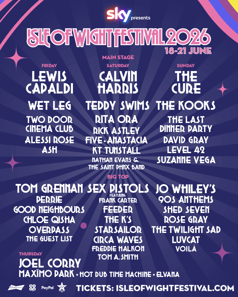 Sky presents the Isle of Wight Festival has today revealed the final additions to its star-studded 2026 line-up. Joining the bill are Rita Ora, Circa Waves, Nathan Evans & The Saint PHNX Band, Overpass, Tom A. Smith, and The Guest List. They join previously announced headliners Lewis Capaldi, Calvin Harris, and The Cure for the iconic event taking place from 18-21 June 2026.