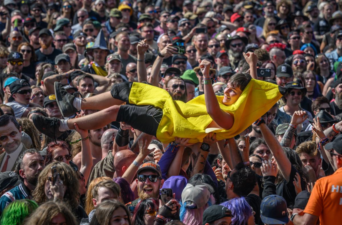 It’s Friday, the gates are open and the sun is shining. Not packing a raincoat feels absolutely reckless for this festival, but the weather app assures me that everything will be ok so sun-cream it is. As seasoned Download goers, we head straight for a merch tent because everyone knows they can and absolutely will sell out of stuff. As per usual nothing has changed and there are simply too few staff to appropriately manage the volume of people queuing, and we wait a solid hour and a half to get our stuff. I think I’ve said this in every review but really, just drop more staff on for the first day, I beg.